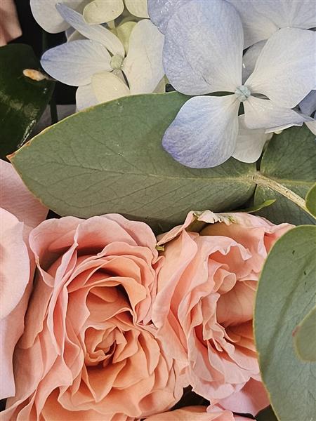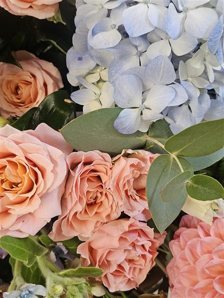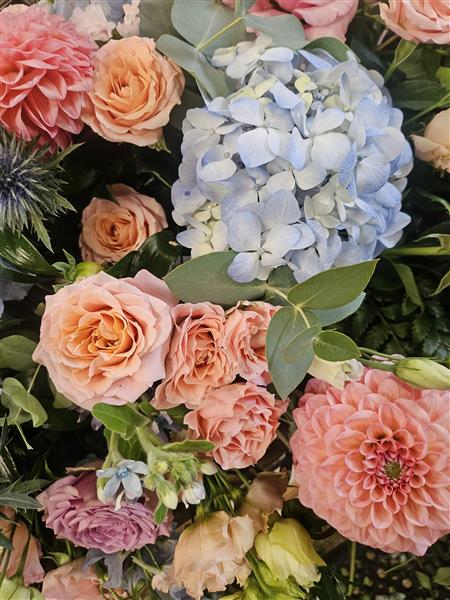 Beautiful seasonal mix of soft blues and peach blooms.