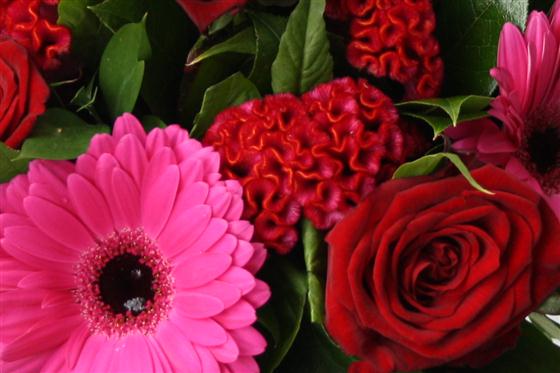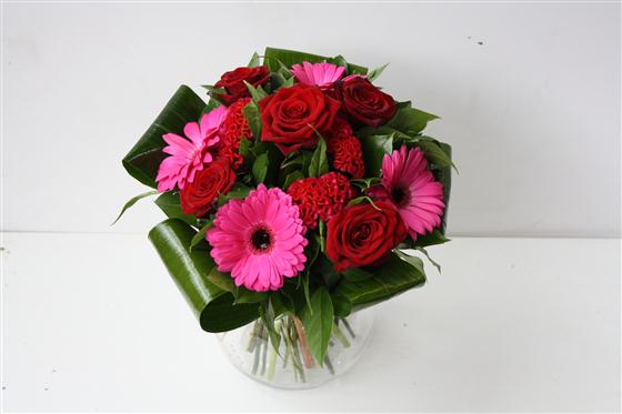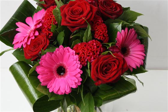 Bright pink gerberas contrast beautifully with luxurious red roses and celosia in this romantic bouquet.