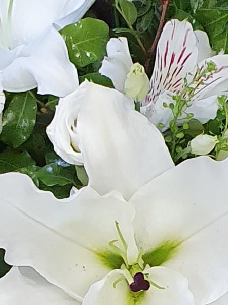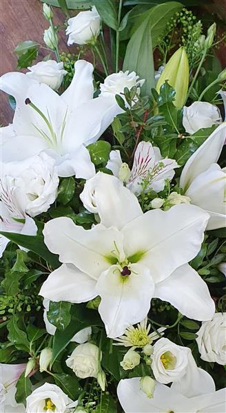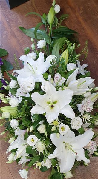 A contemporary single ended spray of lilies, roses and aspidista leaves. Please give ample time when ordering to ensure lilies are in full bloom.